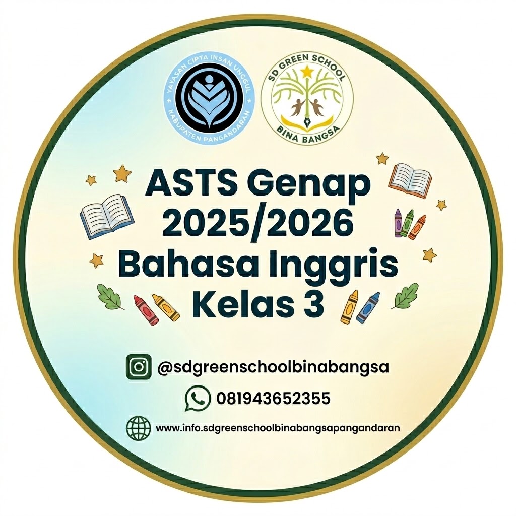 ASTS Genap 2025/2026 Bahasa Inggris Kelas 3 Asesmen Sumatif Tengah Semester Genap 2025/2026 Bahasa Inggris Kelas 3Welcome to the test. Break a leg! Kelas123 1 / 23Students buy food and drinks here. What place is this? Library Canteen Mosque Office 2 / 23Students pray here at the school. What is this place? School yard Library Mosque Canteen 3 / 23Rina asks, "Is it the restroom?" The correct response is ... Yes, I am Yes, it is No, I am not No, they are not 4 / 23A: "Is it the library?" B: "No, _____ is not. It is the office." I they it we 5 / 23Students read books and borrow books here. This place is the ... fishpond field restroom library 6 / 23There is water and fish here at school. 🐟💧This place is called the ... Rice field Fishpond School yard Field 7 / 23Students play and do flag ceremony here. This open space is called the ... Rice field School yard Fishpond Restroom 8 / 23The teacher works and the school principal stays in the ... Canteen Mosque Office Library 9 / 23There is much rice in the 10 / 23Budi washes his hands in the . 11 / 23A: "Is it the ?" B: "Yes, it is. We can pray here." 12 / 23beside = ... di depan di belakang di samping di antara di atas di bawah 13 / 23on = ... di bawah di depan di atas di belakang di samping di antara 14 / 23In front of = .... di depan di belakang di atas di bawah di antara di samping 15 / 23"Between" digunakan untuk mendeskripsikan sesuatu yang berada di antara dua benda atau tempat. True False 16 / 23"The grade 2 classroom is in front of the grade 3 classroom" means the grade 2 class is behind the grade 3 class. True False 17 / 23"Beside" artinya di samping / bersebelahan. True False 18 / 23Which sentence is CORRECT? The library is between the canteen. The fishpond is beside the mosque. The office is next the school yard. The restoom is under of the canteen 19 / 23The cat is hiding _____ the table. (Kucing bersembunyi di bawah meja) on in under beside 20 / 23Doni: "Where is the grade 1 classroom?" Siti: "It is _____ the office." (Kelas 1 berada di depan kantor) behind in front of between under 21 / 23The book is _____ the table. under beside on in front of 22 / 23"The mosque is behind the office." The word behind means ... di depan di samping di antara di belakang 23 / 23The grade 3 classroom is _____ the office and the canteen. behind in front of between under Your score isThe average score is 99% 0% Restart quiz By WordPress Quiz pluginASTS Genap 2025/2026 Matematika Kelas 1 Silahkan isi pertanyaan berikut dengan baik dan benar.Waktu anda sudah selesai.Asesemen Tengah Semester ASTS Genap 2026 Matematika masukan password nya ya Sebelum melaksanakan ujian basa bismillah dulu dan isi nama serta kelasnya Kelas123 1 / 31. Berapa jumlah 50 - 50...? A. 1 B. 0 C. 5 2 / 32. Berapa jumlah 10 + 1...? A. 11 B. 15 C. 10 3 / 33. Berapa jumlah 1 + 1...? A. 3 B. 10 C. 2 tunggu sebentar ya...Your score is 0% By WordPress Quiz plugin